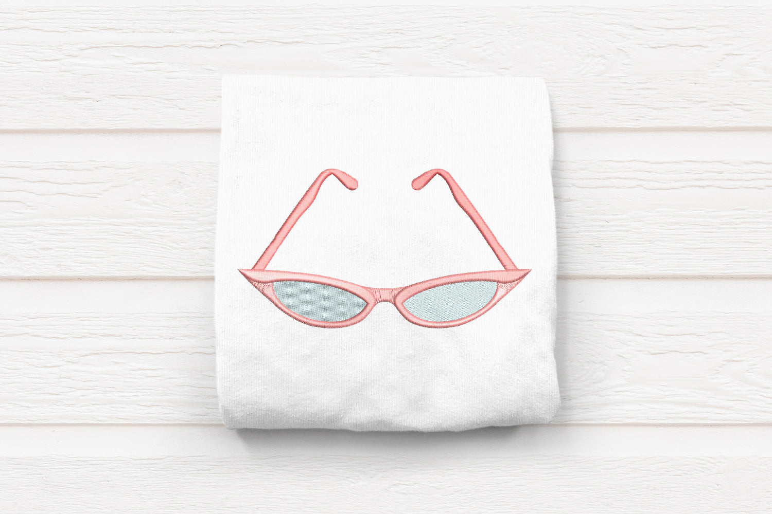 This embroidery design features a pair of vintage cat eye glasses. Make them sunglasses or reading glasses based on your choice of thread for the lens color. You can also skip stitching the arms if you wish.