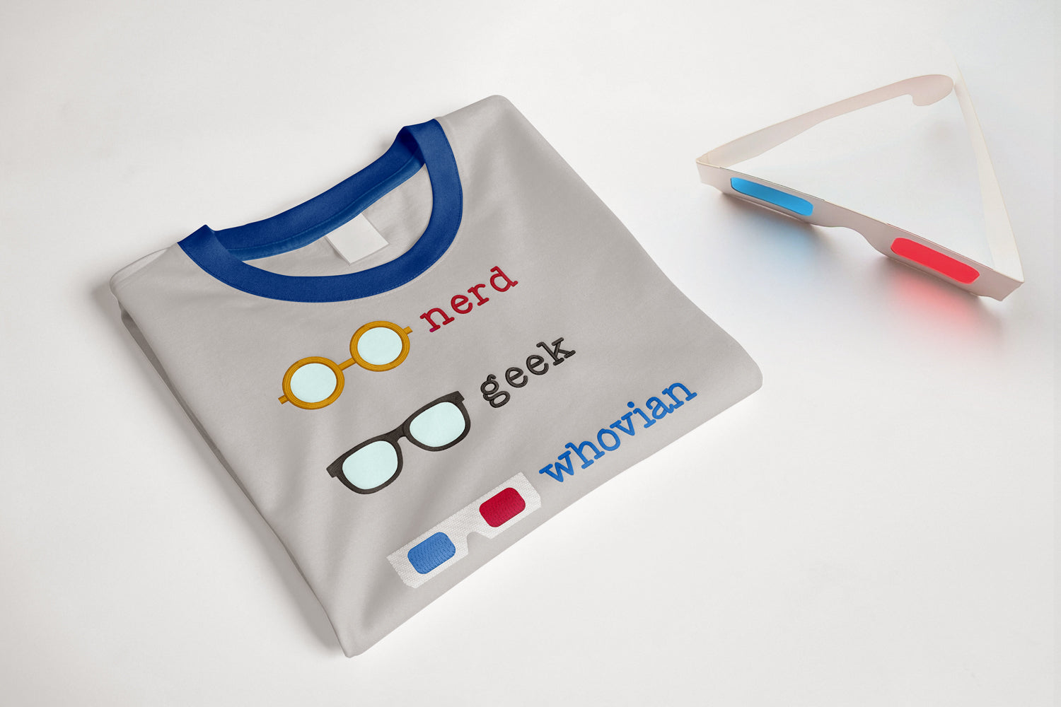 This humorous parody embroidery design features 3 pairs of glasses and what type of person wears them. There are nerdy round glasses, geeky hipster glasses, and the 3D glasses of a Whovian. The top 2 glasses be done with applique lenses if you like at 3 largest sizes. Clear vinyl would be cute for the lenses.
